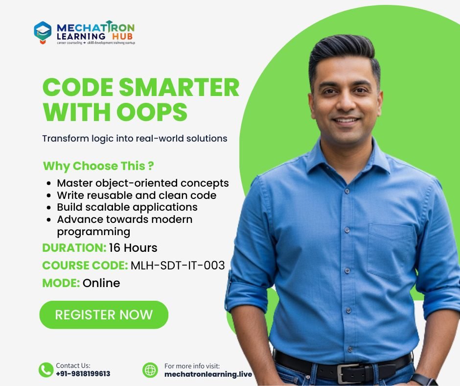 This program introduces learners to Object-Oriented Programming (OOP) principles and their practical implementation in a programming language (e.g., Python, Java, or C++). Through hands-on coding exercises and mini-projects, participants will understand classes, objects, inheritance, polymorphism, and encapsulation, and learn to design robust, modular, and reusable code. The course is suitable for students, freshers, working professionals, and educators looking to strengthen programming fundamentals and software development skills.